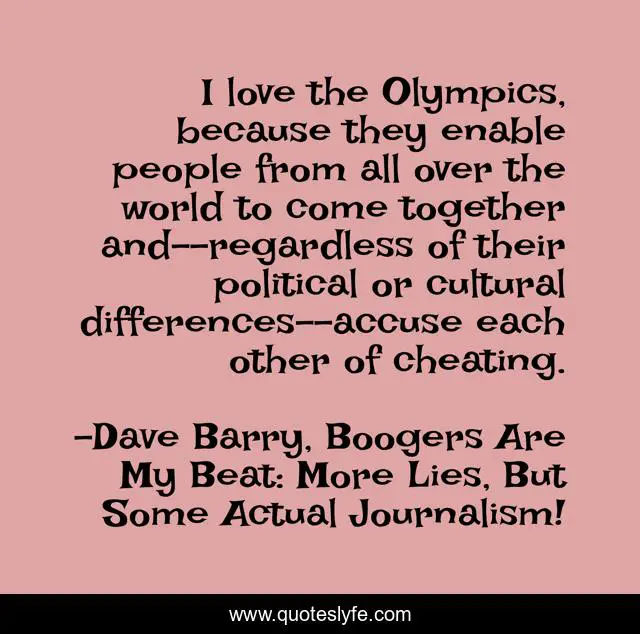 This page presents the quote "I love the Olympics, because they enable people from all over the world to come together and--regardless of their political or cultural differences--accuse each other of cheating.". Author of this quote is Dave Barry, Boogers Are My Beat: More Lies, But Some Actual Journalism!. This quote is about humor, sports,.
