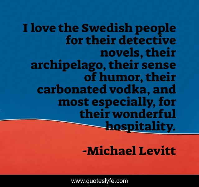 This page presents the quote "I love the Swedish people for their detective novels, their archipelago, their sense of humor, their carbonated vodka, and most especially, for their wonderful hospitality.". Author of this quote is Michael Levitt. This quote is about sense of humor, love, affection, people,.