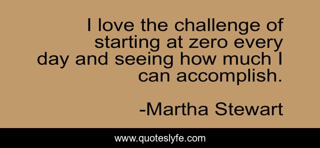 This page presents the quote "I love the challenge of starting at zero every day and seeing how much I can accomplish.". Author of this quote is Martha Stewart. This quote is about confidence, goals,.