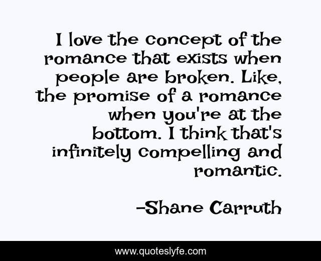 This page presents the quote "I love the concept of the romance that exists when people are broken. Like, the promise of a romance when you're at the bottom. I think that's infinitely compelling and romantic.". Author of this quote is Shane Carruth. This quote is about broken, love, affection, people,.