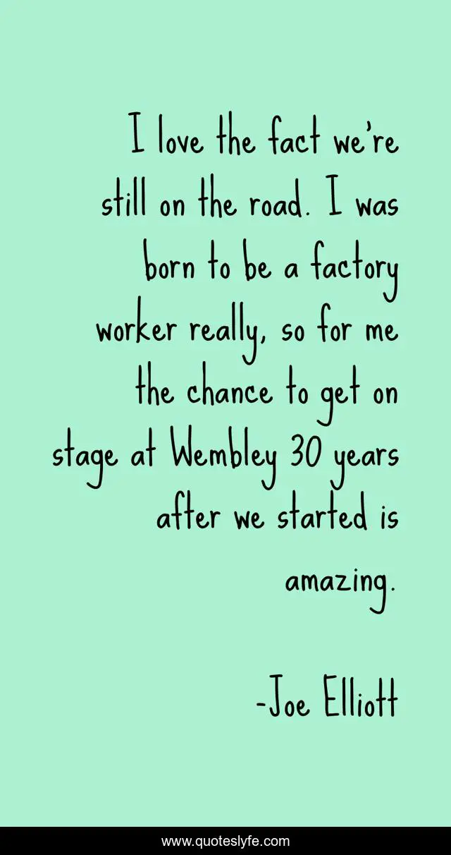 This page presents the quote "I love the fact we're still on the road. I was born to be a factory worker really, so for me the chance to get on stage at Wembley 30 years after we started is amazing.". Author of this quote is Joe Elliott. This quote is about me, love, road, affection,.