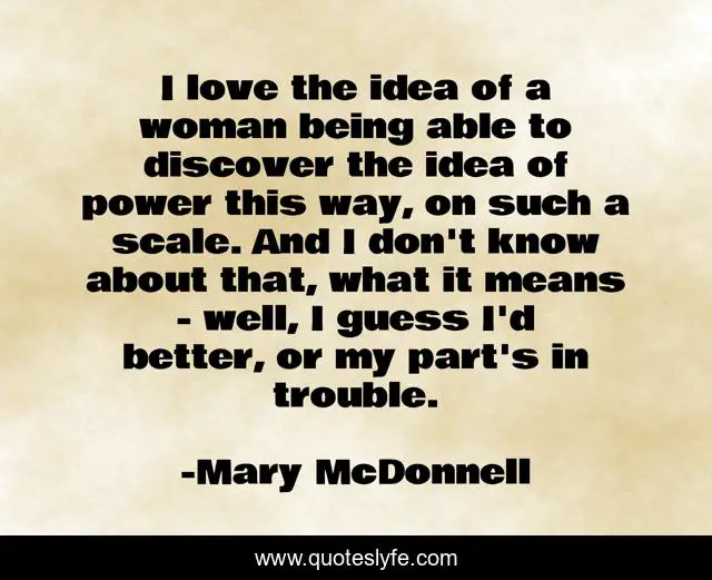 This page presents the quote "I love the idea of a woman being able to discover the idea of power this way, on such a scale. And I don't know about that, what it means - well, I guess I'd better, or my part's in trouble.". Author of this quote is Mary McDonnell. This quote is about woman, love, affection,.