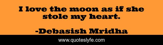 This page presents the quote "I love the moon as if she stole my heart.". Author of this quote is Debasish Mridha. This quote is about love-the-moon, she-stole-my-heart, philosophy, debasish-mridha, quotes, inspirational, enthusiasm, debasish-mridha-m-d,.