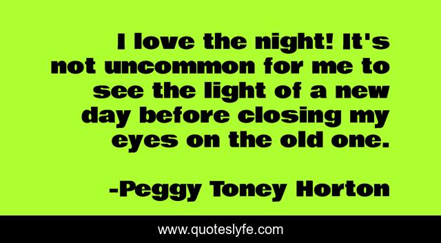 This page presents the quote "I love the night! It's not uncommon for me to see the light of a new day before closing my eyes on the old one.". Author of this quote is Peggy Toney Horton. This quote is about light, close-my-eyes, new-day, night,.