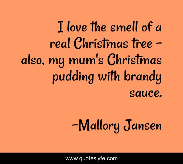 This page presents the quote "I love the smell of a real Christmas tree - also, my mum's Christmas pudding with brandy sauce.". Author of this quote is Mallory Jansen. This quote is about real, love, tree, affection,.