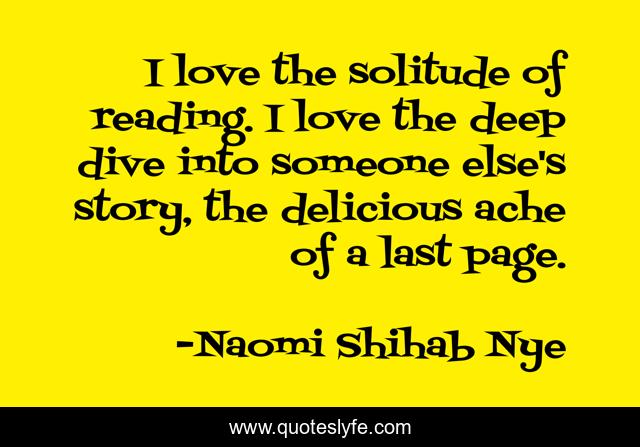 This page presents the quote "I love the solitude of reading. I love the deep dive into someone else's story, the delicious ache of a last page.". Author of this quote is Naomi Shihab Nye. This quote is about books, literature, reading, words,.