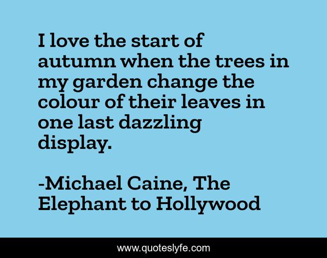 This page presents the quote "I love the start of autumn when the trees in my garden change the colour of their leaves in one last dazzling display.". Author of this quote is Michael Caine, The Elephant to Hollywood. This quote is about autumn, the-elephant-to-hollywood, trees,.