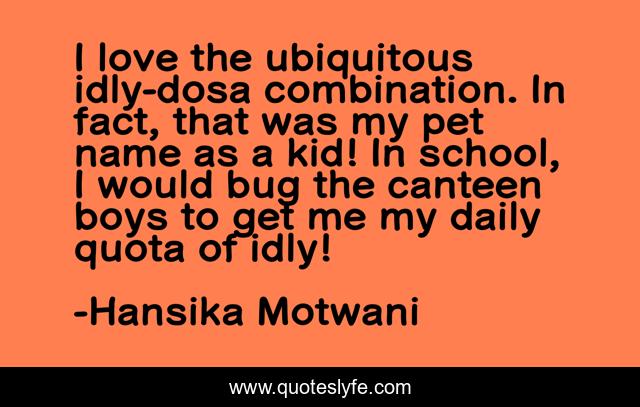 This page presents the quote "I love the ubiquitous idly-dosa combination. In fact, that was my pet name as a kid! In school, I would bug the canteen boys to get me my daily quota of idly!". Author of this quote is Hansika Motwani. This quote is about school, love, daily, affection,.