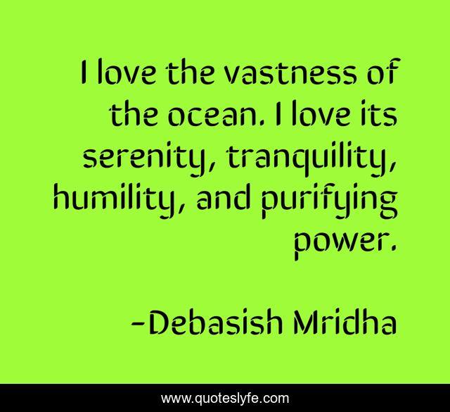 This page presents the quote "I love the vastness of the ocean. I love its serenity, tranquility, humility, and purifying power.". Author of this quote is Debasish Mridha. This quote is about tranquility, philosophy, debasish-mridha, i-love-the-vastness-of-the-ocean, serenity, inspirational, humility, enthusiasm,.
