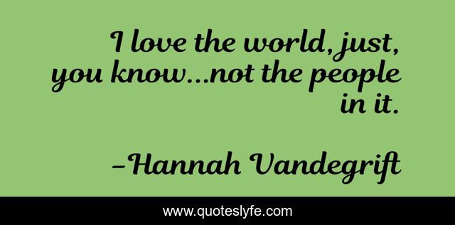 This page presents the quote "I love the world, just, you know...not the people in it.". Author of this quote is Hannah Vandegrift. This quote is about funny, comedy, humor, people, world,.