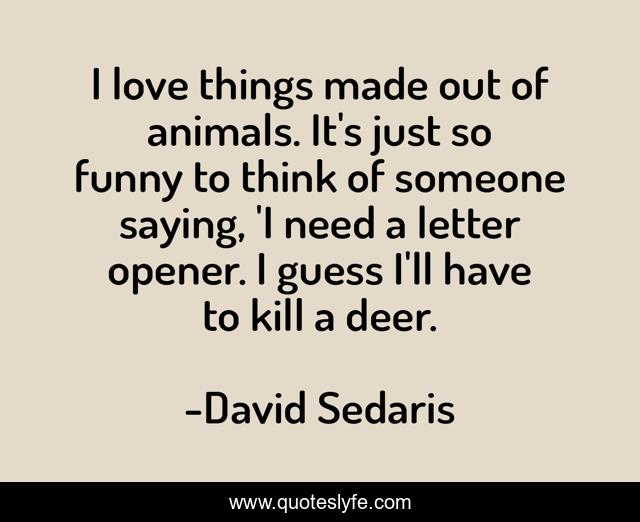 This page presents the quote "I love things made out of animals. It's just so funny to think of someone saying, 'I need a letter opener. I guess I'll have to kill a deer.". Author of this quote is David Sedaris. This quote is about love, animals, think, affection,.
