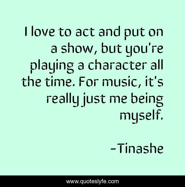 This page presents the quote "I love to act and put on a show, but you're playing a character all the time. For music, it's really just me being myself.". Author of this quote is Tinashe. This quote is about myself, love, affection, time,.