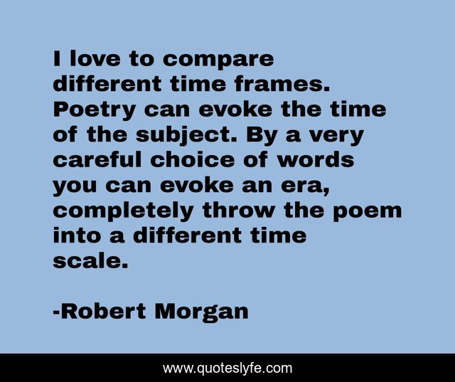 This page presents the quote "I love to compare different time frames. Poetry can evoke the time of the subject. By a very careful choice of words you can evoke an era, completely throw the poem into a different time scale.". Author of this quote is Robert Morgan. This quote is about love, words, affection, time,.