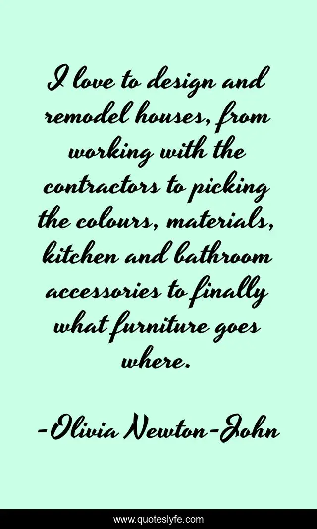 This page presents the quote "I love to design and remodel houses, from working with the contractors to picking the colours, materials, kitchen and bathroom accessories to finally what furniture goes where.". Author of this quote is Olivia Newton-John. This quote is about love, working, affection, kitchen,.