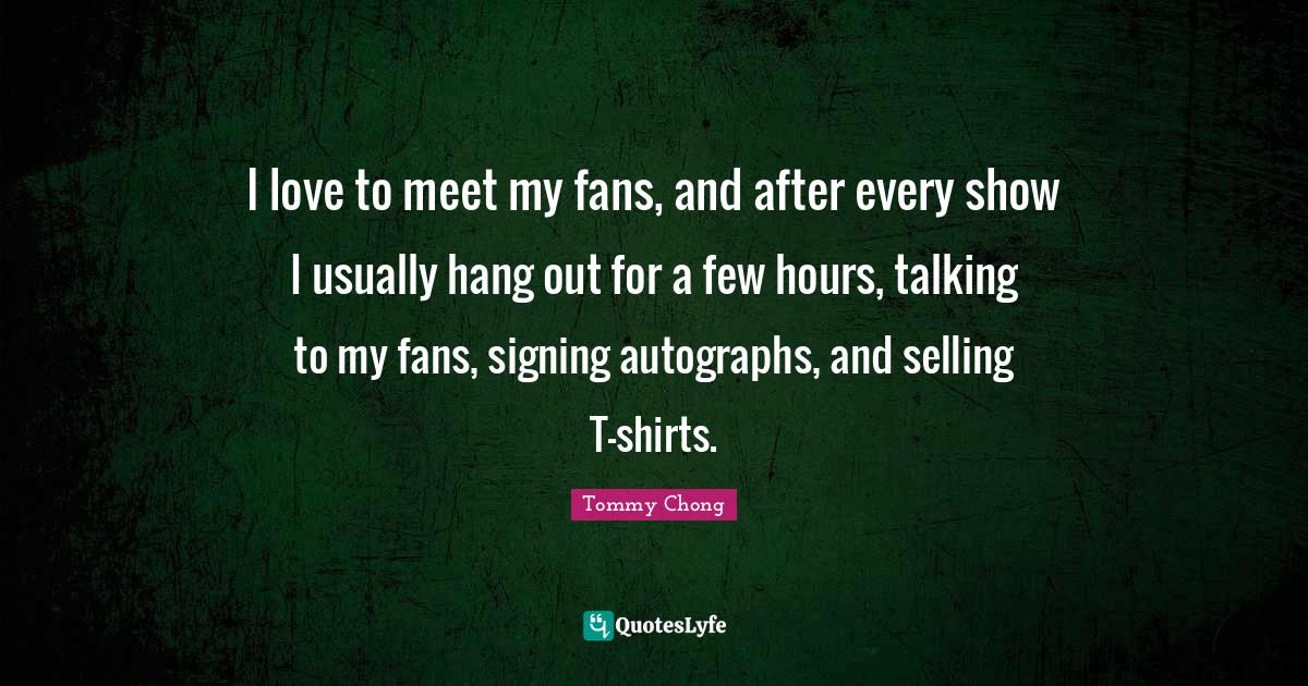 This page presents the quote "I love to meet my fans, and after every show I usually hang out for a few hours, talking to my fans, signing autographs, and selling T-shirts.". Author of this quote is Tommy Chong. This quote is about t shirt, affection, signing autographs, selling, fans, talking, hours, love, shirts,.