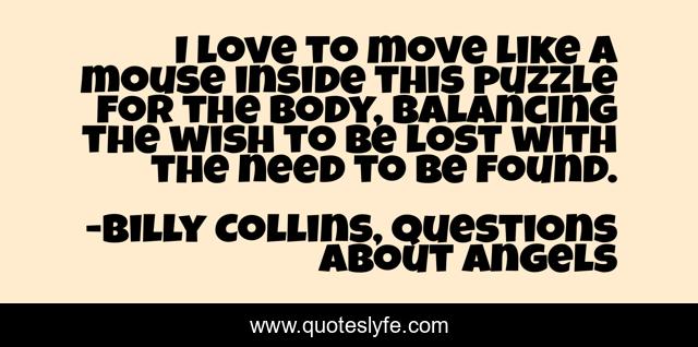 This page presents the quote "I love to move like a mouse inside this puzzle for the body, balancing the wish to be lost with the need to be found.". Author of this quote is Billy Collins, Questions About Angels. This quote is about poetry, contradiction,.