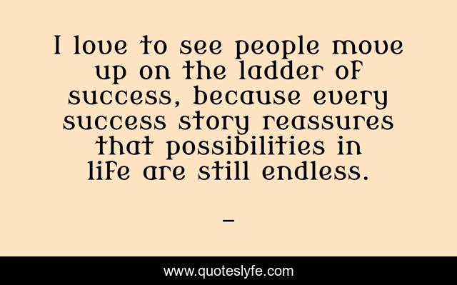 This page presents the quote "I love to see people move up on the ladder of success, because every success story reassures that possibilities in life are still endless.". Author of this quote is . This quote is about edmond-mbiaka, success-story, endless-possibiities, possibilities-in-life,.