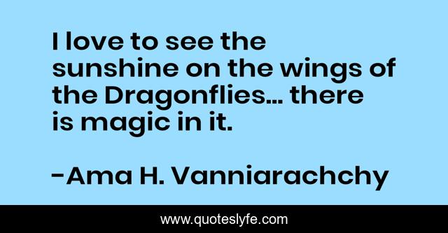 This page presents the quote "I love to see the sunshine on the wings of the Dragonflies... there is magic in it.". Author of this quote is Ama H. Vanniarachchy. This quote is about sunshine, magic, dragonflies,.