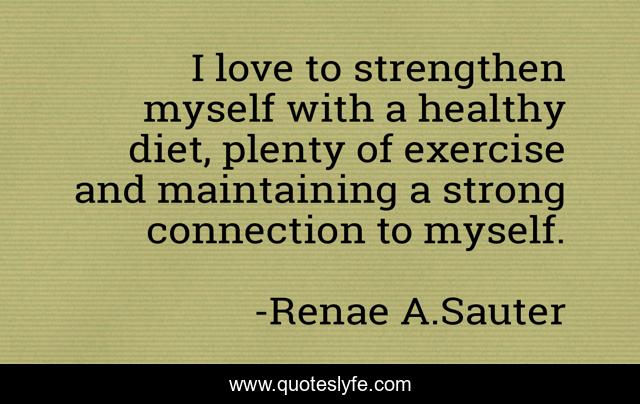 This page presents the quote "I love to strengthen myself with a healthy diet, plenty of exercise and maintaining a strong connection to myself.". Author of this quote is Renae A.Sauter. This quote is about psychology, mental-health, mind-body-spirit, inspirational, self-help, enthusiasm, affirmation,.
