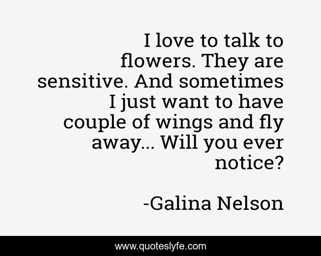 This page presents the quote "I love to talk to flowers. They are sensitive. And sometimes I just want to have couple of wings and fly away... Will you ever notice?". Author of this quote is Galina Nelson. This quote is about love, betrayal, break-up, love-hurts, friendship, affection,.