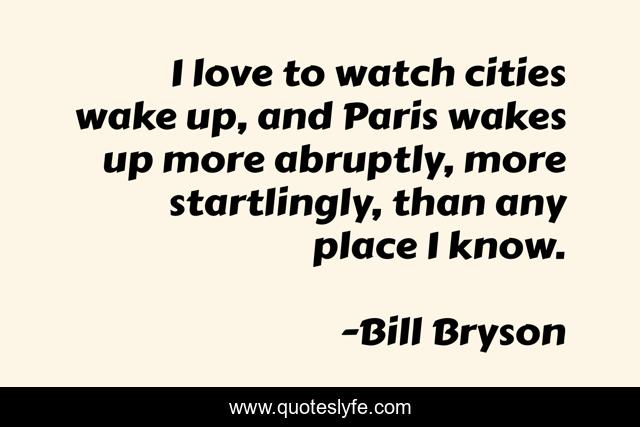 This page presents the quote "I love to watch cities wake up, and Paris wakes up more abruptly, more startlingly, than any place I know.". Author of this quote is Bill Bryson. This quote is about paris, wake-up, sunrise,.