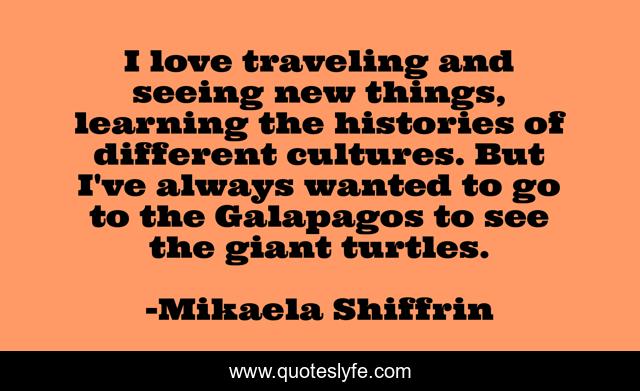 This page presents the quote "I love traveling and seeing new things, learning the histories of different cultures. But I've always wanted to go to the Galapagos to see the giant turtles.". Author of this quote is Mikaela Shiffrin. This quote is about see, new things, love, affection,.