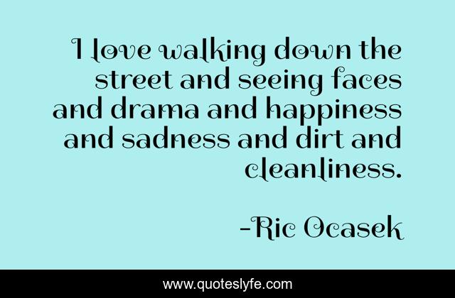 This page presents the quote "I love walking down the street and seeing faces and drama and happiness and sadness and dirt and cleanliness.". Author of this quote is Ric Ocasek. This quote is about sadness, walking, happiness,.
