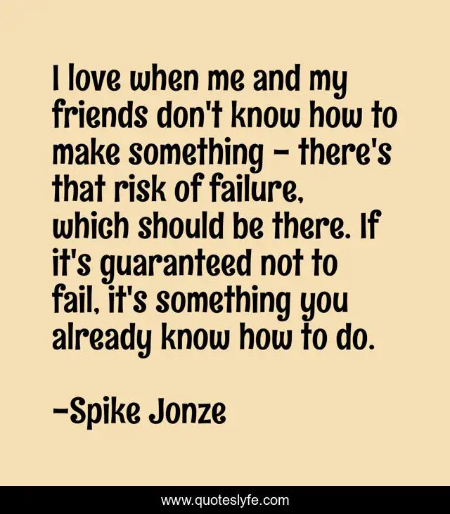 This page presents the quote "I love when me and my friends don't know how to make something - there's that risk of failure, which should be there. If it's guaranteed not to fail, it's something you already know how to do.". Author of this quote is Spike Jonze. This quote is about me, love, friends, affection,.