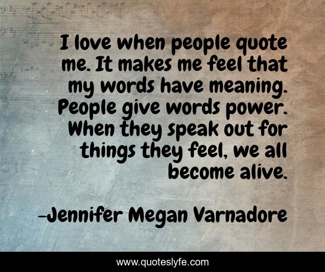 This page presents the quote "I love when people quote me. It makes me feel that my words have meaning. People give words power. When they speak out for things they feel, we all become alive.". Author of this quote is Jennifer Megan Varnadore. .