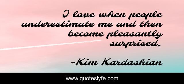 This page presents the quote "I love when people underestimate me and then become pleasantly surprised.". Author of this quote is Kim Kardashian. This quote is about me, underestimate, people,.
