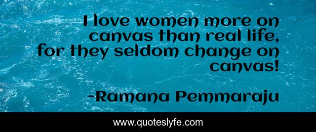 This page presents the quote "I love women more on canvas than real life, for they seldom change on canvas!". Author of this quote is Ramana Pemmaraju. This quote is about love, beauty, photography, canvas-of-life, change, eccentricity, art, painting, affection,.