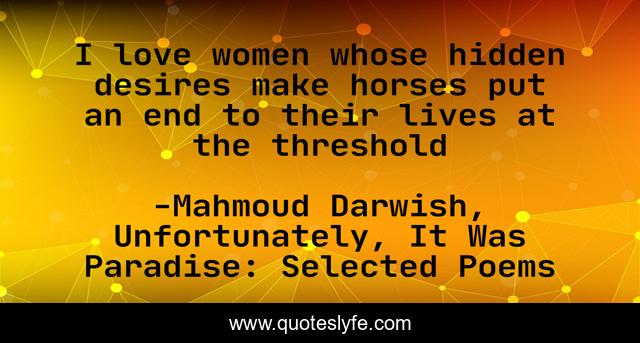 This page presents the quote "I love women whose hidden desires make horses put an end to their lives at the threshold". Author of this quote is Mahmoud Darwish, Unfortunately, It Was Paradise: Selected Poems. This quote is about middle-east, poetry,.
