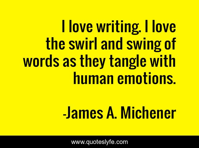 This page presents the quote "I love writing. I love the swirl and swing of words as they tangle with human emotions.". Author of this quote is James A. Michener. .