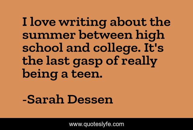 This page presents the quote "I love writing about the summer between high school and college. It's the last gasp of really being a teen.". Author of this quote is Sarah Dessen. This quote is about love, school, college, affection,.