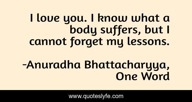 This page presents the quote "I love you. I know what a body suffers, but I cannot forget my lessons.". Author of this quote is Anuradha Bhattacharyya, One Word. This quote is about lover, love, affection, loving,.
