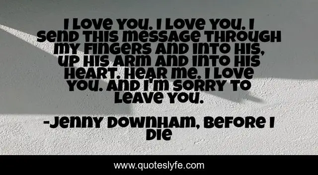 This page presents the quote "I love you. I love you. I send this message through my fingers and into his, up his arm and into his heart. Hear me. I love you. And I'm sorry to leave you.". Author of this quote is Jenny Downham, Before I Die. This quote is about sorrow, love, tessa, affection, leaving,.