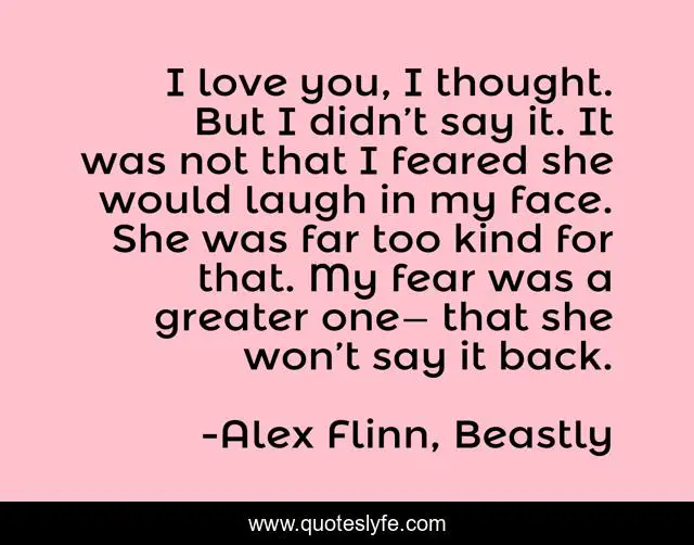 This page presents the quote "I love you, I thought. But I didn’t say it. It was not that I feared she would laugh in my face. She was far too kind for that. My fear was a greater one— that she won’t say it back.". Author of this quote is Alex Flinn, Beastly. This quote is about fear, love, affection,.