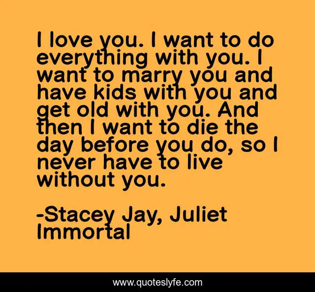 This page presents the quote "I love you. I want to do everything with you. I want to marry you and have kids with you and get old with you. And then I want to die the day before you do, so I never have to live without you.". Author of this quote is Stacey Jay, Juliet Immortal. This quote is about life, love, marry, affection, in-love,.