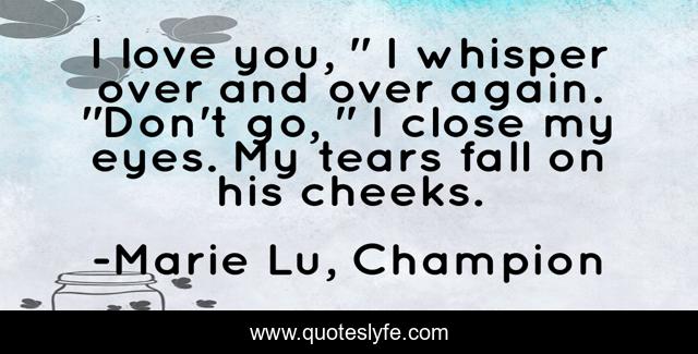 This page presents the quote "I love you, " I whisper over and over again. "Don't go, " I close my eyes. My tears fall on his cheeks.". Author of this quote is Marie Lu, Champion. This quote is about june-iparis, daniel-altan-wing, love, dying, affection,.