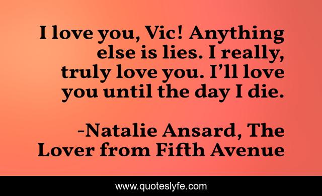 This page presents the quote "I love you, Vic! Anything else is lies. I really, truly love you. I’ll love you until the day I die.". Author of this quote is Natalie Ansard, The Lover from Fifth Avenue. This quote is about love, love-story, affection, love-novel,.