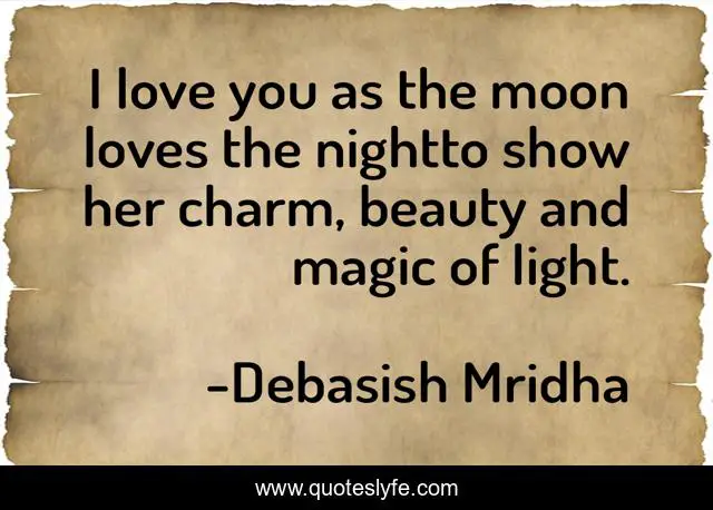 This page presents the quote "I love you as the moon loves the nightto show her charm, beauty and magic of light.". Author of this quote is Debasish Mridha. This quote is about life, love, knowledge, inspirational, intelligence, philosophy, wisdom, quotes, affection,.
