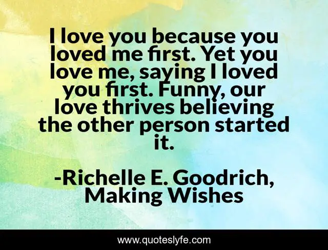 This page presents the quote "I love you because you loved me first. Yet you love me, saying I loved you first. Funny, our love thrives believing the other person started it.". Author of this quote is Richelle E. Goodrich, Making Wishes. This quote is about emotion, relationships, love-me-first, love, richelle-e-goodrich, lovers, richelle, perception, richelle-goodrich,.