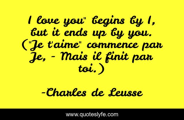This page presents the quote "I love you" begins by I, but it ends up by you. ("Je t'aime" commence par Je, - Mais il finit par toi.)". Author of this quote is Charles de Leusse. This quote is about amour, love, i, finir, toi, je, end, affection,.