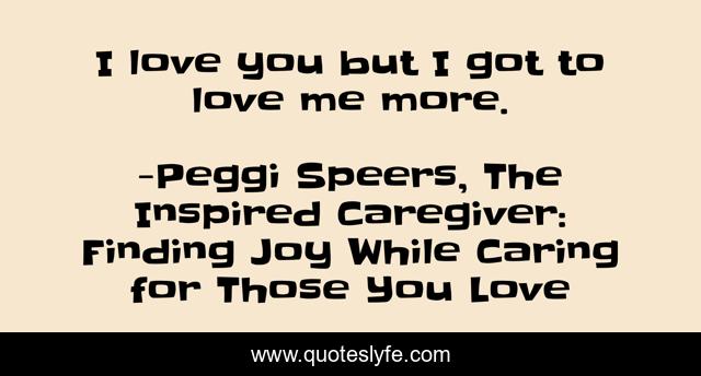 This page presents the quote "I love you but I got to love me more.". Author of this quote is Peggi Speers, The Inspired Caregiver: Finding Joy While Caring for Those You Love. This quote is about relationships, love, relationsihps-love, caregiver, empowerment-of-women, lovers-quarrels, relationship, abuse, elder-care,.