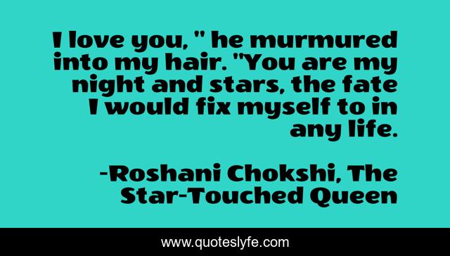 This page presents the quote "I love you, " he murmured into my hair. "You are my night and stars, the fate I would fix myself to in any life.". Author of this quote is Roshani Chokshi, The Star-Touched Queen. This quote is about love, affection,.