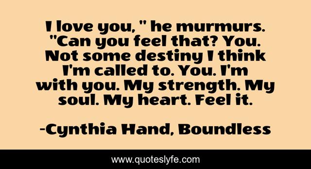 This page presents the quote "I love you, " he murmurs. "Can you feel that? You. Not some destiny I think I'm called to. You. I'm with you. My strength. My soul. My heart. Feel it.". Author of this quote is Cynthia Hand, Boundless. .