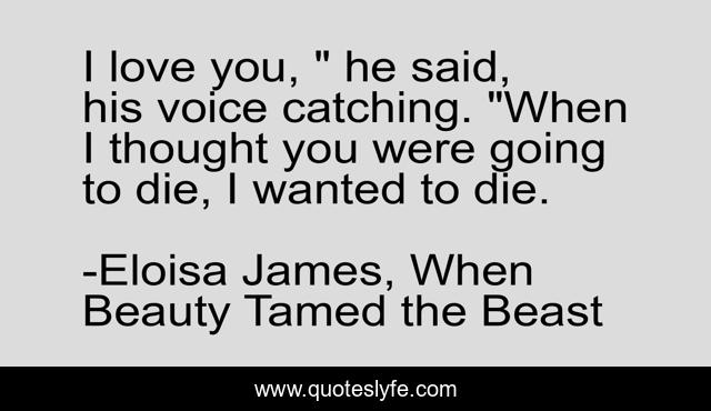 This page presents the quote "I love you, " he said, his voice catching. "When I thought you were going to die, I wanted to die.". Author of this quote is Eloisa James, When Beauty Tamed the Beast. This quote is about relationships, death, love, affection,.