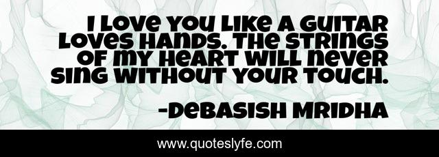 This page presents the quote "I love you like a guitar loves hands. The strings of my heart will never sing without your touch.". Author of this quote is Debasish Mridha. This quote is about love, my-heart, philosophy, debasish-mridha, quotes, i-love-you, inspirational, enthusiasm, debasish-mridha-m-d,.