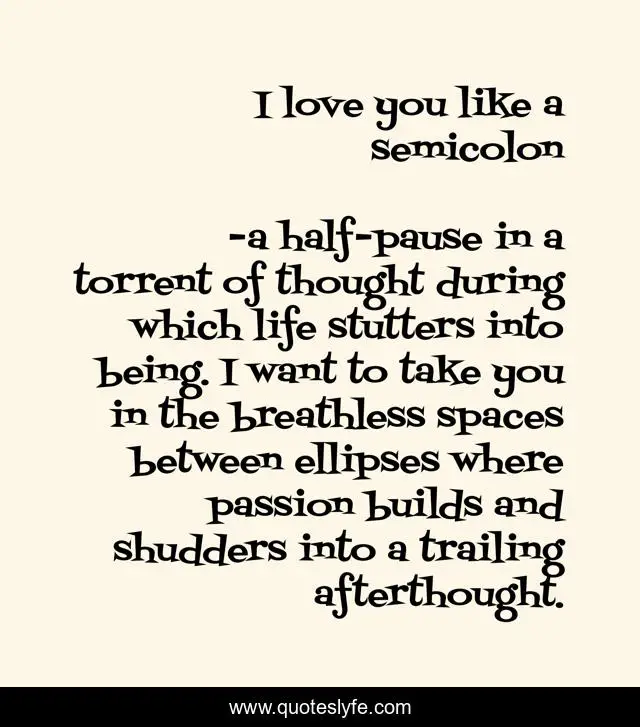 "a half-pause in a torrent of thought during which life stutters into being. I want to take you in the breathless spaces between ellipses where passion builds and shudders into a trailing afterthought. Quotes." Quoteslyfe.com, 2025. Sat. 06 Dec. 2025. <https://www.quoteslyfe.com/quote/I-love-you-like-a-semicolon-93163>.