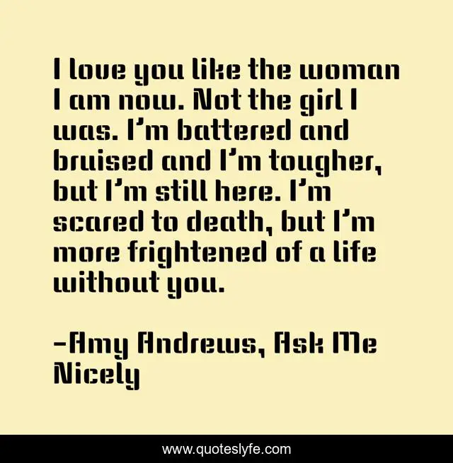 This page presents the quote "I love you like the woman I am now. Not the girl I was. I’m battered and bruised and I’m tougher, but I’m still here. I’m scared to death, but I’m more frightened of a life without you.". Author of this quote is Amy Andrews, Ask Me Nicely. This quote is about romance, contemporary, brazen,.
